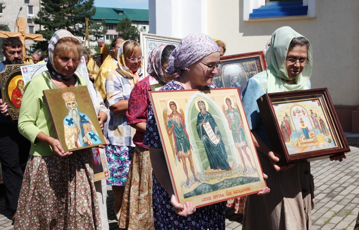 В каждом храме крестоходцев с любовью встречали священники и верующие. После чтения акафиста Животворящему Кресту Господню гости рассказывали о Крестном ходе, его цели – объехать наш край ради объединения людей из любви к Отечеству, для укрепления православных в вере, призыву людей к молитве и покаянию. В дар преподносили списки икон Магаданской Божией Матери и Казанской Божией Матери.