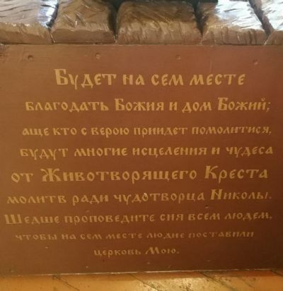 Во время явления Креста был глас: “Будет на месте сем церковь моя”. Об этом рассказали митрополиту Ростовскому, и он повелел поставить там церковь. Пришли строители, нашли место, где можно построить, немного вдалеке от места явления. Срубили три венца и разошлись на ночлег. Утром пришли продолжать строительство – ничего нет. Все исчезло – бревна, инструмент. Стали искать. И видят, что бревна плавают именно в том месте, где в свете был явлен Крест, в самой топи болота, где невозможно ничего построить. И снова голос сверху: “На месте сем поставьте церковь Мою”. Задумались – как же там поставить, когда там болото?