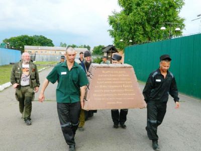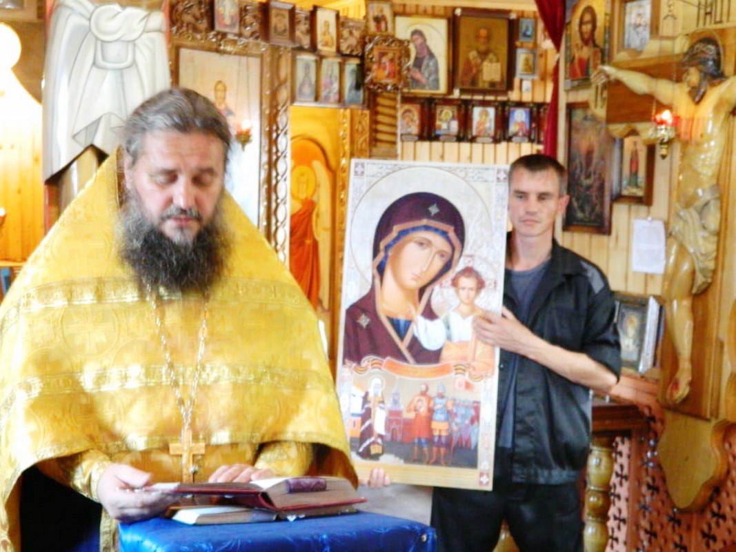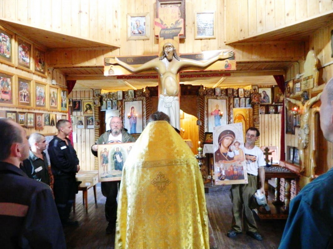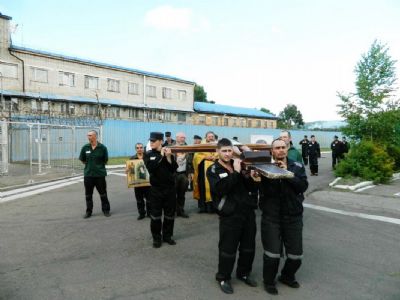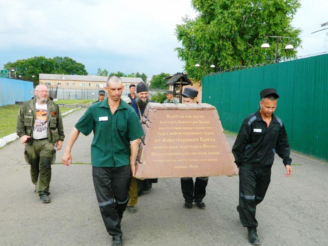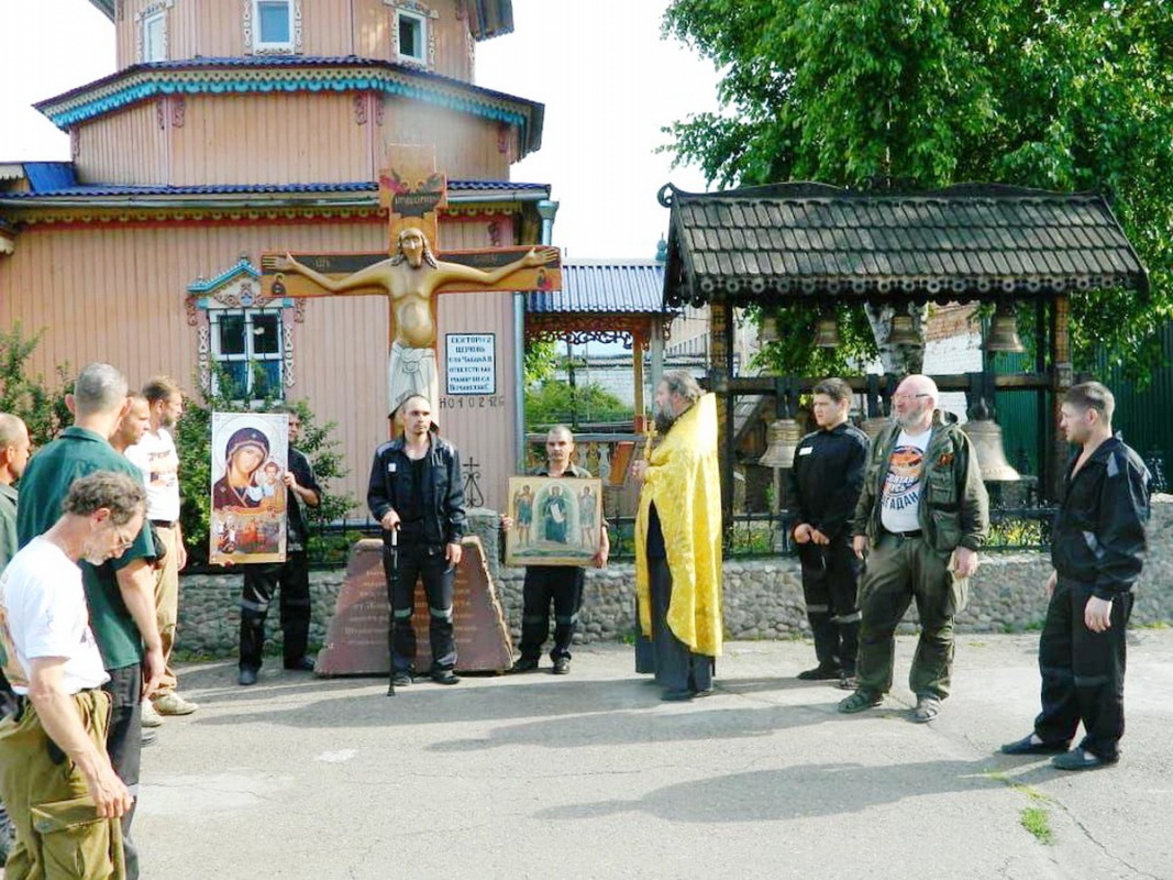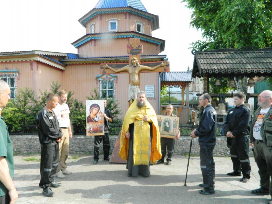 После Тимофеевки мы поехали в Кавалерово. Крест установили на площадке прямо перед храмом. Отец Александр пригласил народ.. Отслужили молебен с акафистом, рассказали о Кресте, подарили иконы. И двинулись в Чугуевку, в ИК-31. Отец Анатолий договорился, чтобы нас запустили в зону. Мы сначала установили Крест возле тюремного храма, совершили молебен с акафистом и обошли зону Крестным ходом с Крестом.