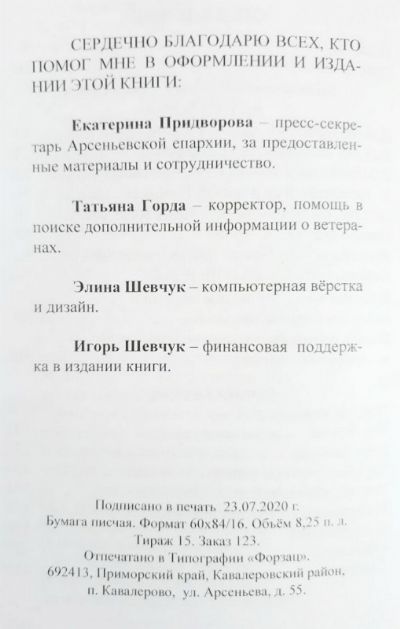 На протяжении нескольких месяцев шла работа над материалами, которые по крупицам собирались из архивов, воспоминаний родственников, присылались близкими ветеранов на адрес Арсеньевской епархии. По мере готовности, очерки и стихи публиковались на сайте епархии, в других социальных сетях, в краевой газете «Северное Приморье». Я бесконечно благодарна всем, кто принимал участие в этой работе. Слова моей искренней признательности за тесный контакт, постоянную моральную, творческую и документальную поддержку пресс-секретарю Арсеньевской епархии Екатерине Придворовой! Мы, несмотря на разделяющее нас расстояние, находились в очень тесном контакте, обсуждали и планировали следующие публикации, обменивались отзывами читателей. А добрых, искренних и очень душевных откликов людей, со словами благодарности, на опубликованные материалы было так много, что это придавало силы и желание продолжать проект. Сердечно благодарю за помощь в верстке и оформлении дизайна книги мою внучку Элину Шевчук! Спасибо всем тем людям, кто присылал фотографии и воспоминания о ветеранах, которые легли в основу вышедшей книги. Это – Тамара Владимировна Ершова; семья Назаровых (Сансецких) – Елена Владимировна, Валерия Александровна и Даша; Татьяна Анатольевна Горда; Светлана Бондаренко.