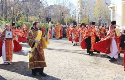 По заамвонной молитве глава Приморской митрополии возглавил крестный ход вокруг храма, по завершении которого было совершено славление священномученику Павлу.