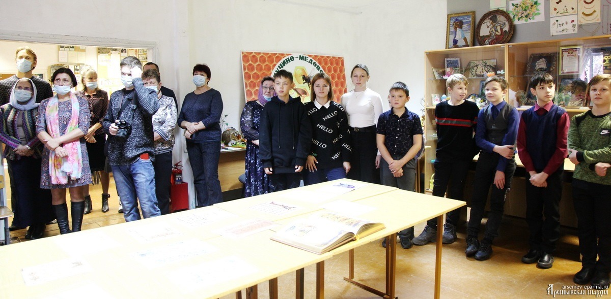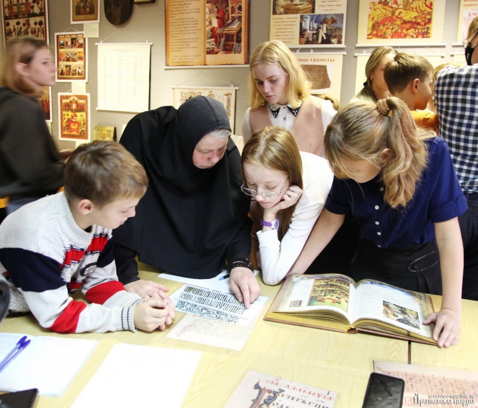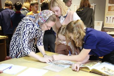 А за день до открытия выставки ученики восьмого «В» класса пришли в музей, чтобы принять участие в литературно-историческом квесте «Легенда о первом «Апостоле»». Вначале всех детей разделили на три команды. В ходе игры каждая команда посетила шесть остановок, на каждой из которых были свои уникальные темы и задания. Представители Арсеньевской епархии поговорили с детьми о нашей истории, о возникновении славянской письменности, о православных книгах, о том, что русская культура наследует древние и великие традиции славянской культуры. За выполнение заданий каждая команда получала заработанные баллы, а за прохождение каждой из остановок им выдавали часть фразы-обращения Ивана Фёдорова, которую он написал на первом «Апостоле», сложённом в Печатном дворе Москвы.