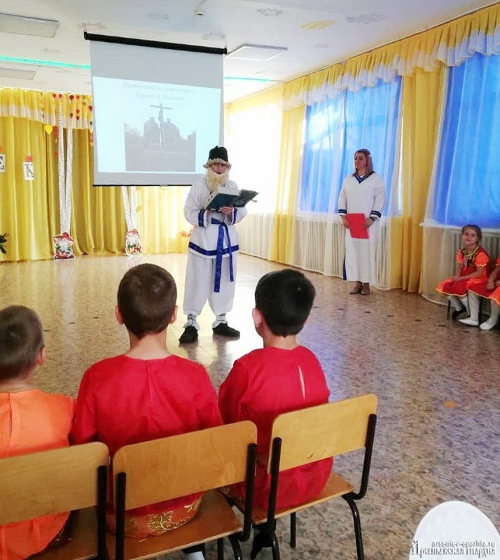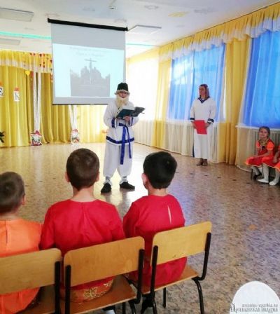 В гости к дошкольникам пришел дед-Азбуковед. Разделившись на две команды – «Умницы» и «Знайки» – ребята приняли участие в викторине. Они дали верные ответы на вопросы о том, как обменивались посланиями первобытные люди, откуда взялись надписи на скалах, как появились иероглифы, какие материалы использовались для письма, как создавалась славянская азбука. Ребята отгадывали загадки, пели песни о России и играли в увлекательные игры. Детям была показана красочная презентация о христианских просветителях Кирилле и Мефодии, о памятниках, которые установлены им в разных городах и странах.