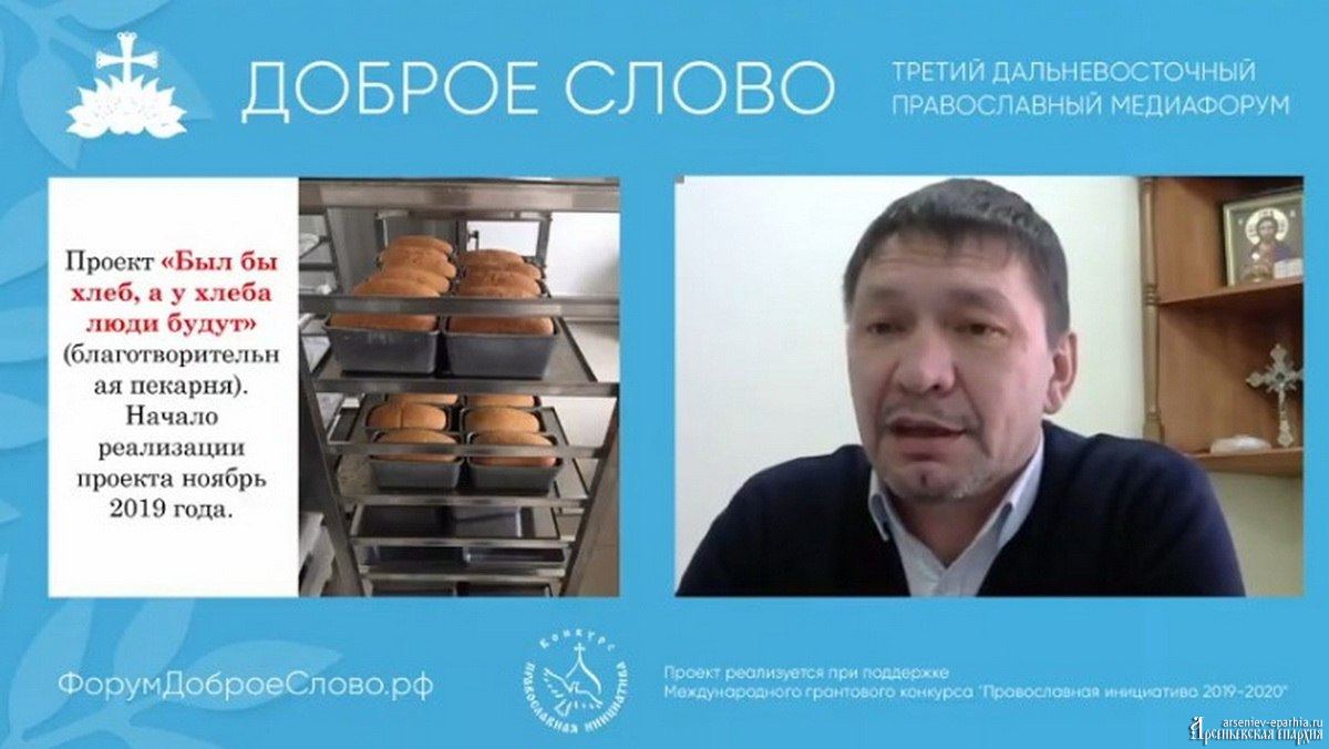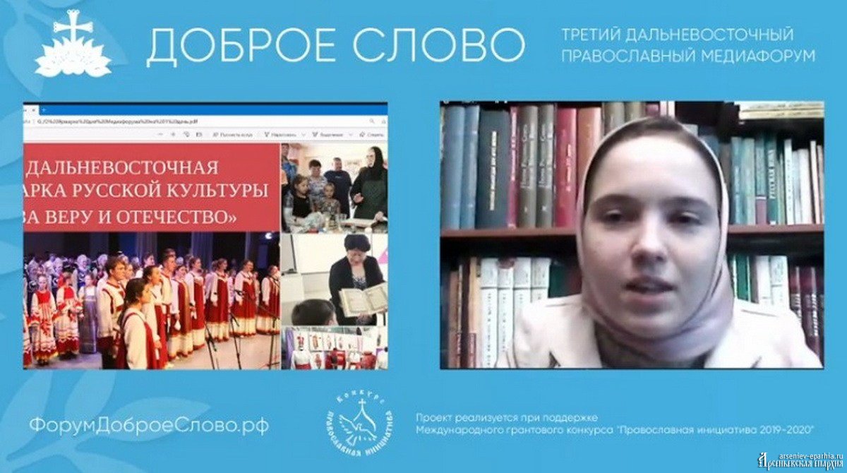 Пресс-секретарь Арсеньевской епархии Екатерина Придворова представила проект “Дальневосточная ярмарка русской культуры”. Он реализуется уже второй год. Но в этом году, в отличие от прошлого свои коррективы внесла пандемия коронавируса, и пришлось мероприятия перенести в онлайн-формат. Среди мероприятий ярмарки: мастер-классы по иконописи, выставки русского народного костюма и предметов быта, старинных книг, квесты по русской письменности. Благодаря онлайн-формату к участию смогли подключиться участники даже из-за рубежа. Знаковое мероприятие проекта “Ярмарка хоров” перенесена на следующий год. Проект получил широкое медиаосвещение.