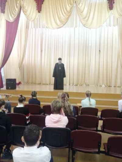 Затем Батюшка затронул тему «Храм». Ученики поделились своими знаниями о том, что храм – это место встречи небесного и земного, что батюшка в храме помогает людям молиться. Ученики показали знания заповедей. Большое внимание уделили заповеди «Почитай отца и мать свою». Отец Андрей акцентировал внимание, что семья – это малая Церковь, Троица.