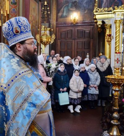 В богослужении приняли участие воспитанники школы-интерната при Николо-Шартомском монастыре и воспитанницы православной школы имени свт. Тихона Задонского. Молодые люди были иподиаконами, а девочки пели на клиросе.