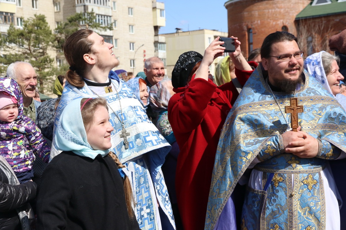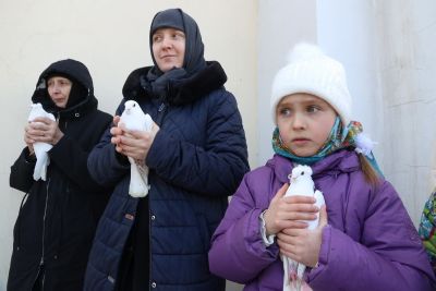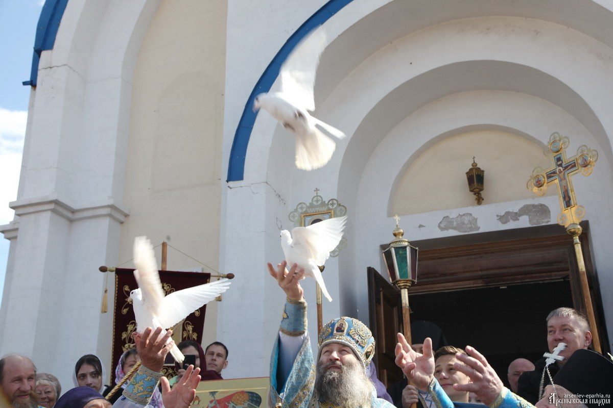 По традиции, в конце Крестного хода вокруг храма Владыка вместе со священниками отпустил в небо голубей. И здесь произошло чудо: обычно голуби сразу улетают, только их и видели. А в этот раз они полетели прямо в храм! И долго-долго сидели на храмовых дверях, словно наблюдая за всем происходящим с высоты.