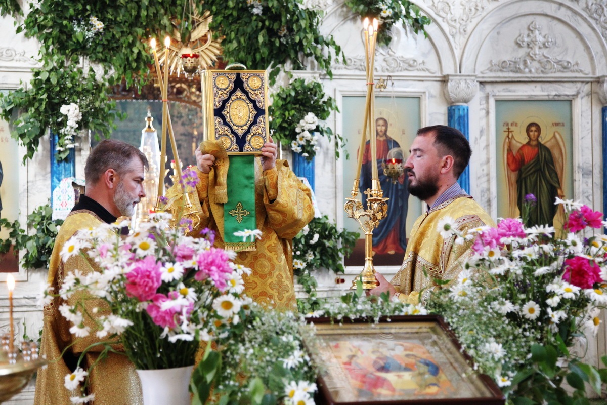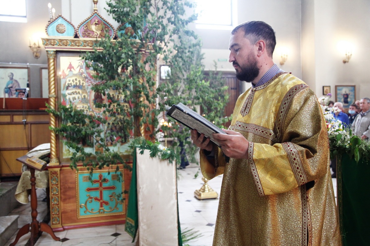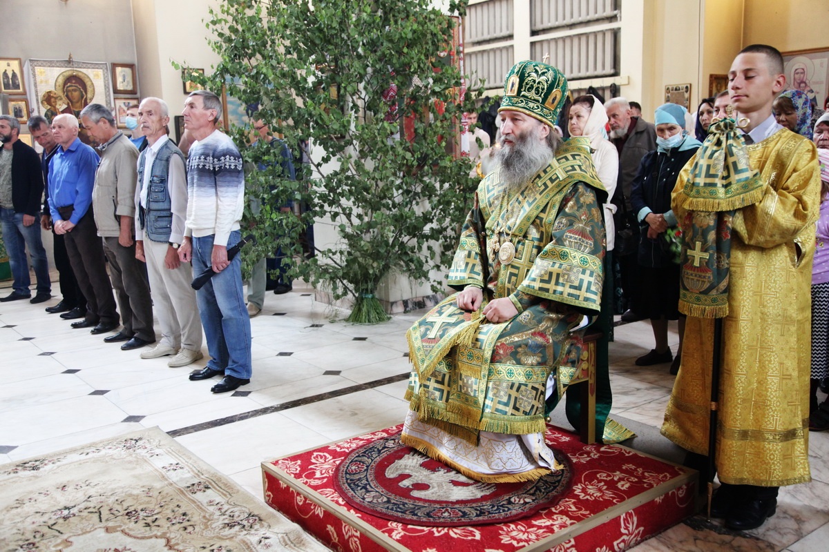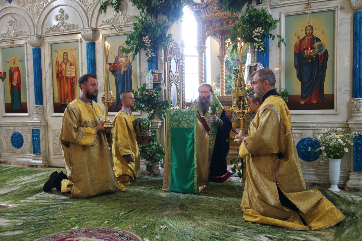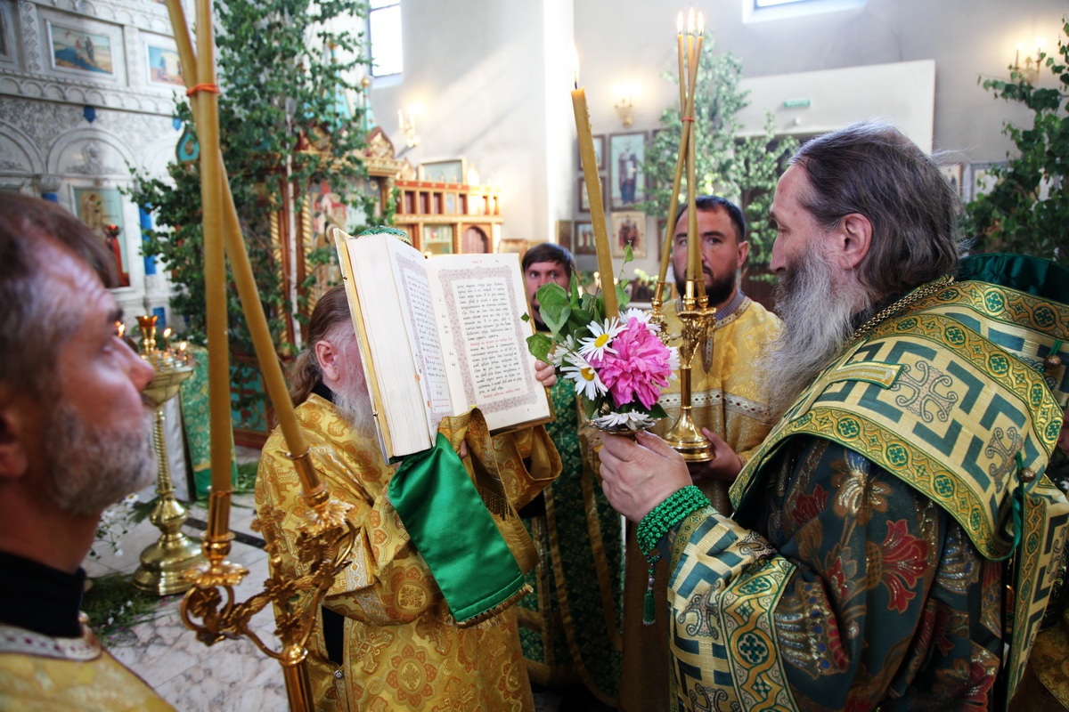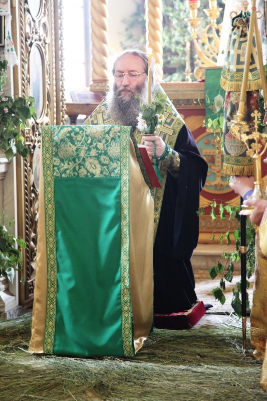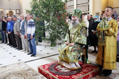 После окончания Литургии была совершена праздничная вечерня, на которой были прочитаны три особые коленопреклоненные молитвы, и впервые со времени празднования Пасхи верующие преклонили колена в храме.