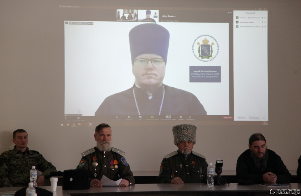 Возглавил конференцию Епископ Арсеньевский и Дальнегорский Гурий, сказавший слово о необходимости соработничества и успешной совместной работы епархии и Даубихинского городского казачьего общества. С приветственным словом к собравшимся на конференцию, в «онлайн формате», по благословению митрополита Ставропольского и Невинномысского Кирилла, председателя Синодального комитета по взаимодействию с казачеством обратился руководитель отдела по взаимодействию с епархиями Синодального комитета иерей Иоанн Малков.