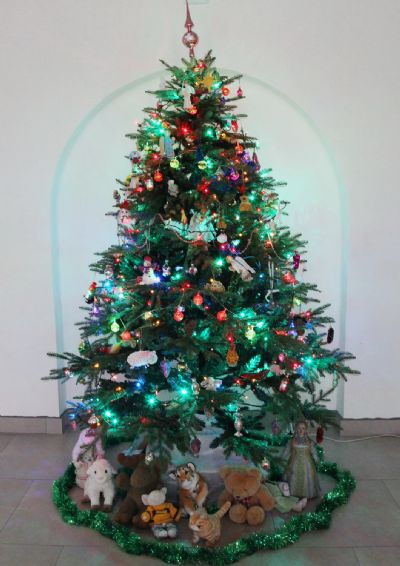 Какое Рождество без Символа вечной жизни, которую нам даровал Христос. Наш Центр также украшен пушистой и зеленой елью. Игрушки на ней эксклюзивные и сшитые вручную, есть подаренные, а есть стеклянные, как из нашего детства. Гирлянды на елке напоминают пуговки от облачения священнослужителя. От нашей красавицы невозможно отвести глаз.