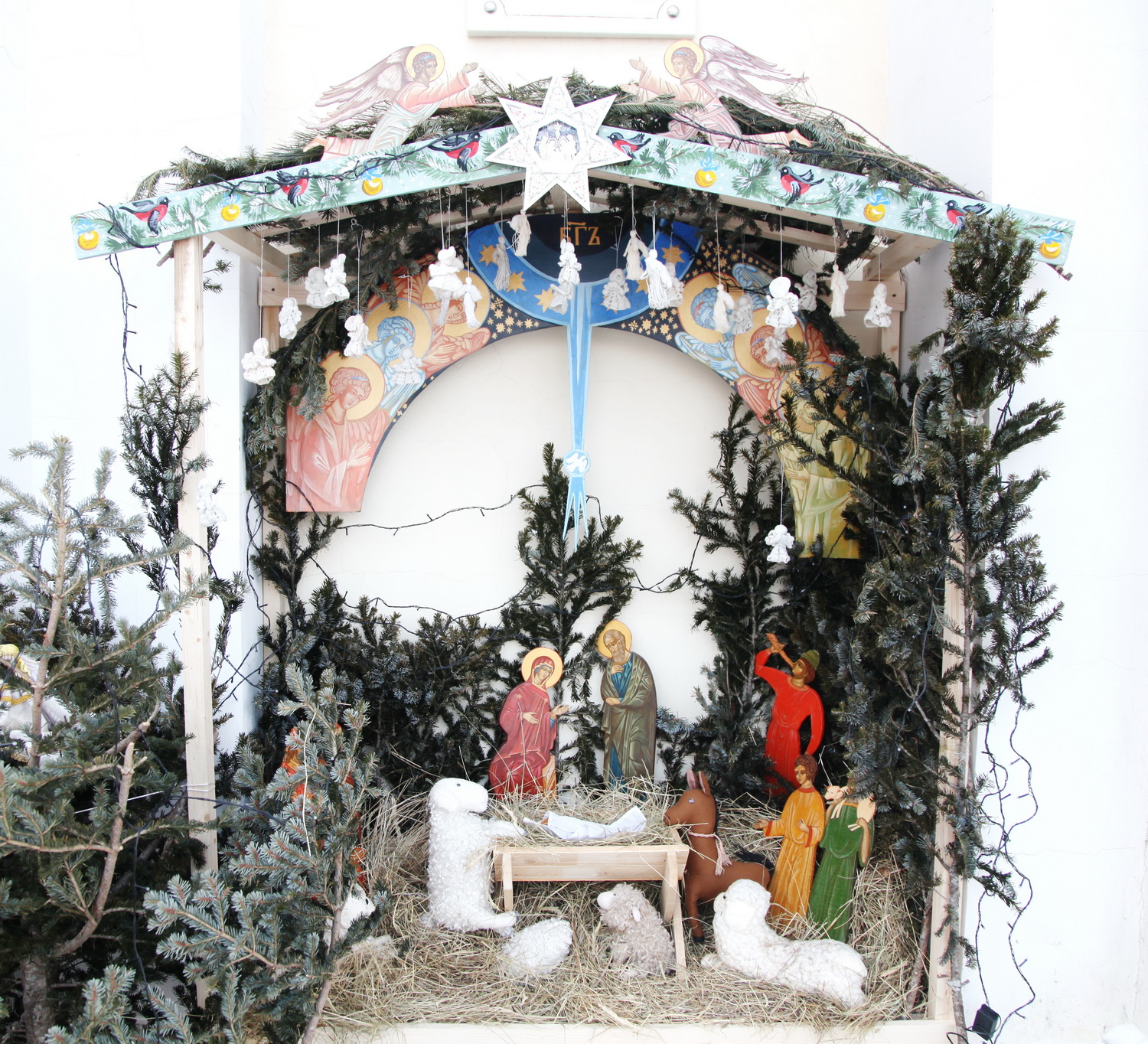 В Духовно-просветительском центре сестры монашеской обители соорудили вертеп. Рассматривая его, мы настраиваем себя на восприятие грядущего праздника. Вертеп нам рассказывает о многом. Хотелось бы напомнить о символичности даров, принесенными волхвами. Своими дарами они рассказывают о том, что родился непросто Младенец. Золото подарили, как Царю земному, ладан – Царю небесному, а смирну, как символ будущих страданий и смерти Христа на Кресте за грехи человеческие. Каждая фигура в вертепе сделана вручную с молитвой и любовью. Над вертепом сияет Вифлеемская звезда, указывавшая волхвам путь к рожденному Спасителю.
