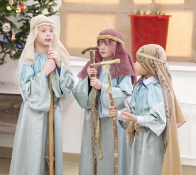 Юные артисты показали спектакль, пели рождественские песни, рассказывали стихотворения. По традиции с помощью родителей и педагогов они подготовили для Владыки подарок – Рождественский вертеп.