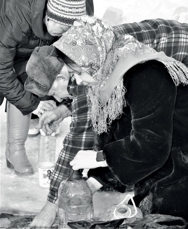 В то время, как служится молебен, людские разговоры затихают и стоит особенная тишина. Отец Анатолий три раза опускает в прорубь крест, испрашивая на воду Божие благословение. Затем окропляет собравшихся. Освящение воды – это видимый, торжественный церковный чин, который говорит нам о присутствии Бога здесь, на земле. В песнопениях на Крещение Господне есть слова «Днесь вод освящается естество», то есть сегодня освящается все естество. Если даже в каком-то водоеме вода не освящалась, принято считать, что в день Крещения вся вода становится святой, даже из крана.