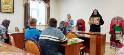 Необычный интерактивный урок прошёл 6 марта в воскресной школе Кафедрального Благовещенского Собора. Его тема – «Русский костюм в народных сказках». Он разработан для учащихся 1-5 классов общеобразовательных учреждений Арсеньевской епархии в рамках проекта «Российский патриотизм сквозь века», цель которого – приобщение детей к русской традиционной культуре.