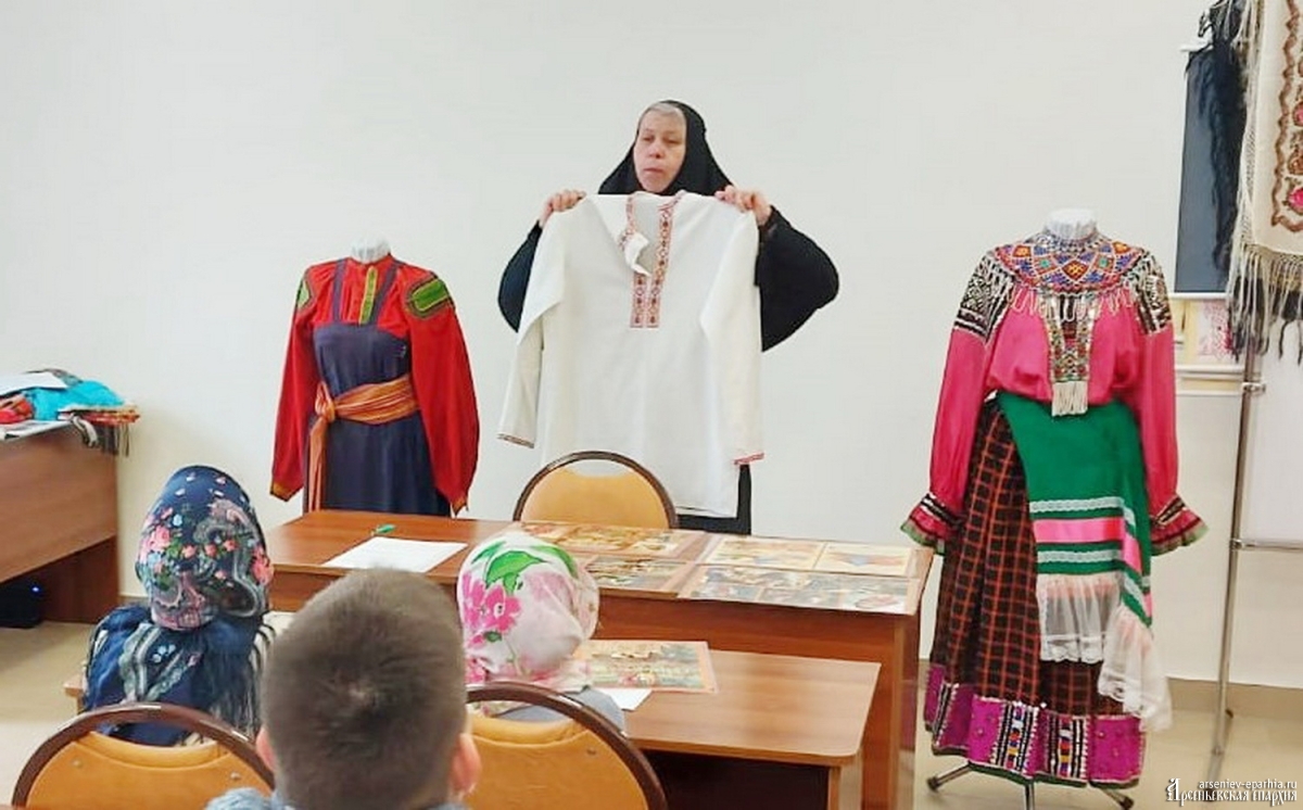 Инокиня Мария (Воробьева), заведующая Музеем русской культуры, организатор уроков и квестов по славянской письменности, показала детям женский и мужской костюмы 18-19 веков – экспонаты из коллекции епархиального Музея русской культуры. Она познакомила ребят с элементами крестьянской одежды: сарафаном, рубахой, платками, поясами, лаптями – и рассказала об их происхождении, процессе изготовления, назначении, символике. Дети получили возможность внимательно рассмотреть и оценить красоту и прочность вышивки и плетения, девочки примерили на себя большие, яркие платки.
