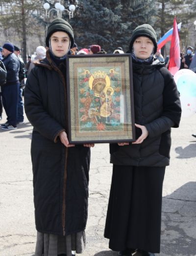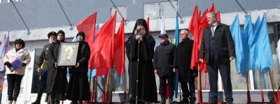 В своей речи Владыка Гурий выступил в поддержку нашего президента, сравнив его с птицей Феникс, который в такое непростое время для России и Украины из пепла войны рождает новый мир. Ключевым мотивом выступлений ораторов прозвучал призыв: «Мы своих не бросаем!»