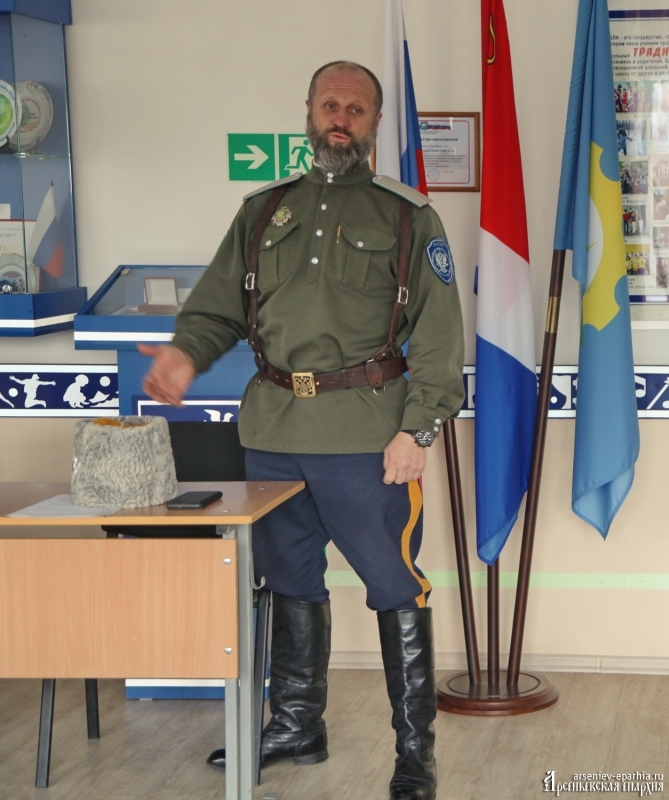 Она подчеркнула, что сегодня её ученики – гордость не только школы, но и города и края. Духовную жизнь казачат, начиная с 1 класса, направляет Православная Церковь – об этом рассказал иерей Арсеньевской епархии Димитрий Овчинников, преподаватель православной культуры МОБУ СОШ № 10, духовник Даубихинского казачьего общества.