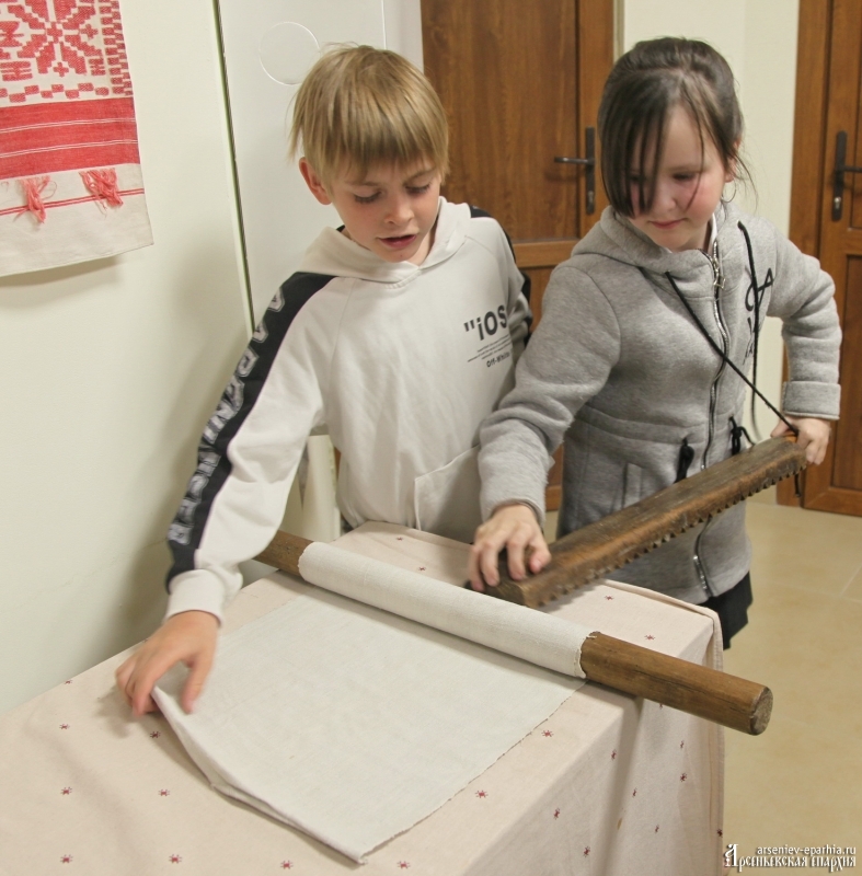Интересную и познавательную экскурсию по залам музеев с разными экспозициями провела инокиня Мария (Воробьева). Она рассказала о нашей русской одежде и русском быте. В музеях экспонаты трогать нельзя, а в наших дети не только потрогали, но попробовали их в деле: подержали утюги, чугунки, лапти, разглядели прялку.