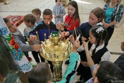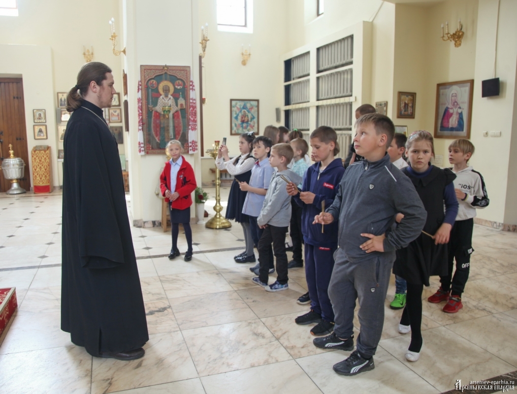 Батюшка рассказал об устройстве храма, иконах, показал, где находится алтарь, как правильно нужно креститься, ставить свечи. По окончании экскурсии отец Димитрий каждому подарил икону вмч. Георгия Победоносца.