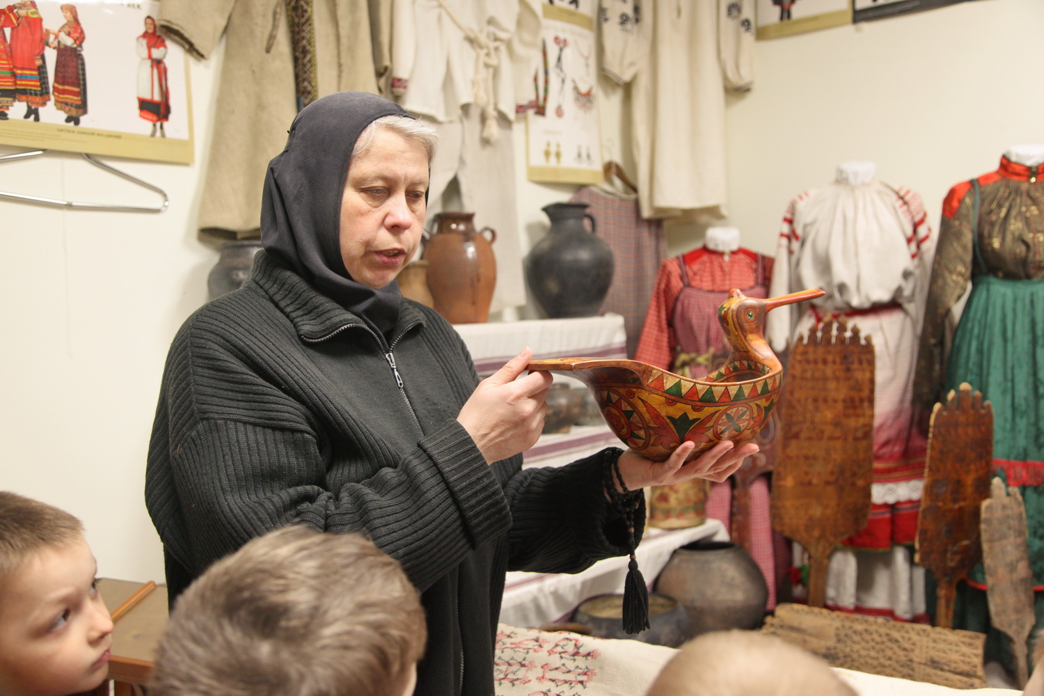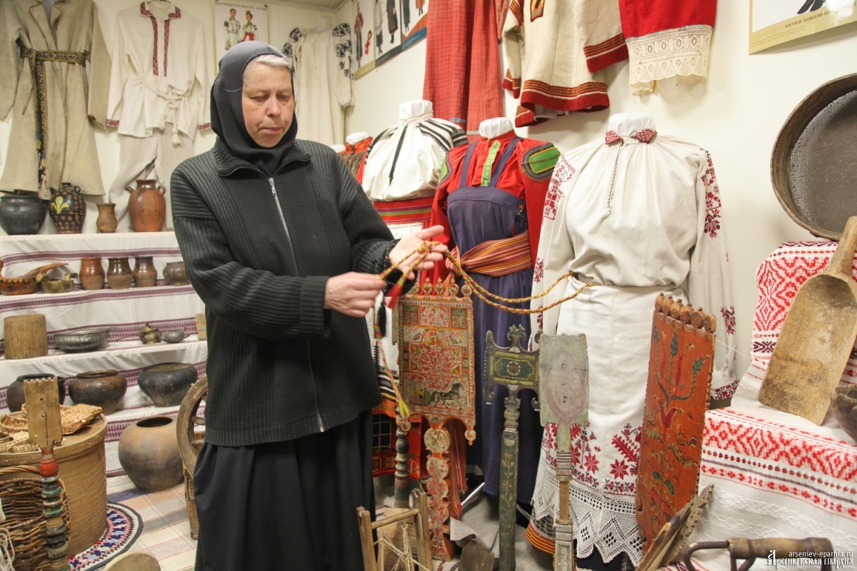 Инокиня Мария (Воробьева) радушно встретила ребят и провела очень интересную и познавательную экскурсию по залу музея с разными экспозициями, которые помогли понять и увидеть быт наших предков.