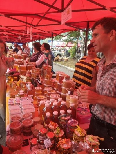 Пасечники со всего края представили на ярмарке свои лучшие сорта янтарного лакомства. На самый сладкий гастрономический фестиваль года приезжают со всех уголков края и не только. В этом году на фестивале были гости из Алтая, Башкирии, Якутии, Санкт-Петербурга, Москвы, и даже из Кореи и Китая. Гости фестиваля оценили по достоинству угощение – блины, чебуреки, плов, шашлыки, пироги и т.д.