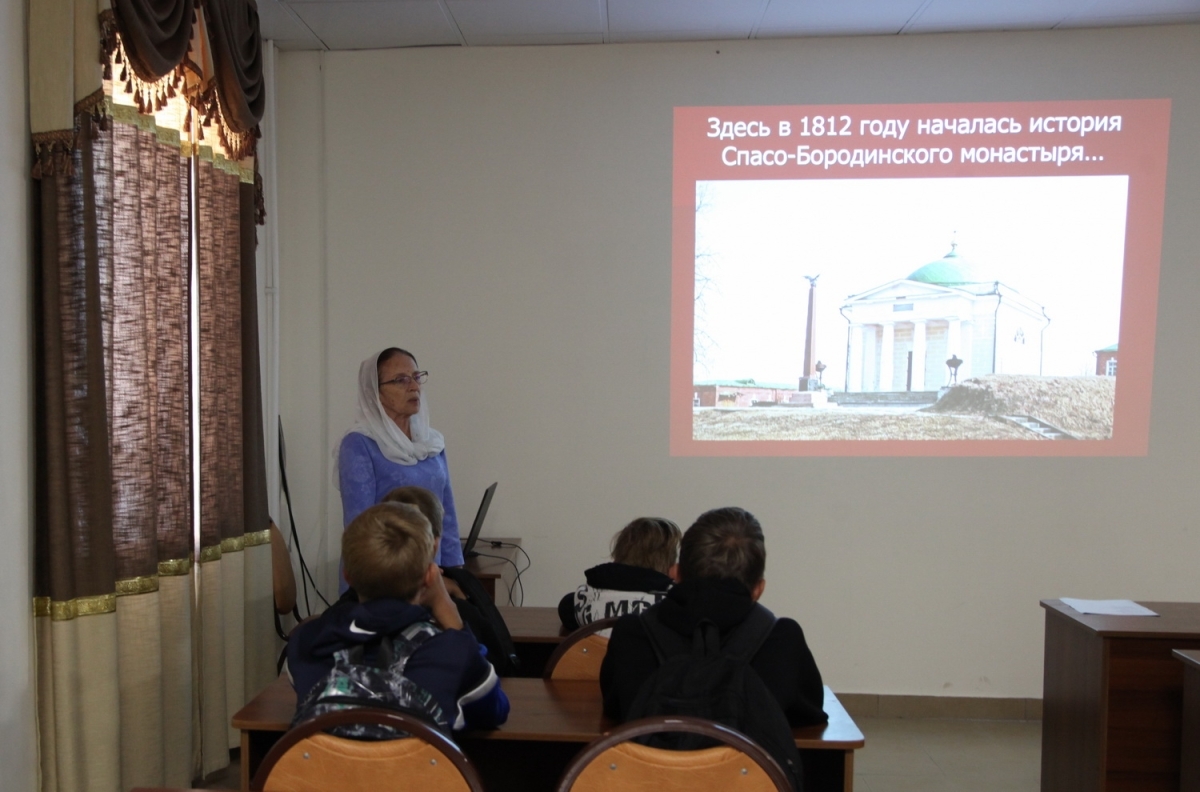 Рассказ сопровождался показом видеоролика, иллюстрирующим историю Спасо-Бородинского монастыря – первого памятника воинам, павшим в великом сражении.