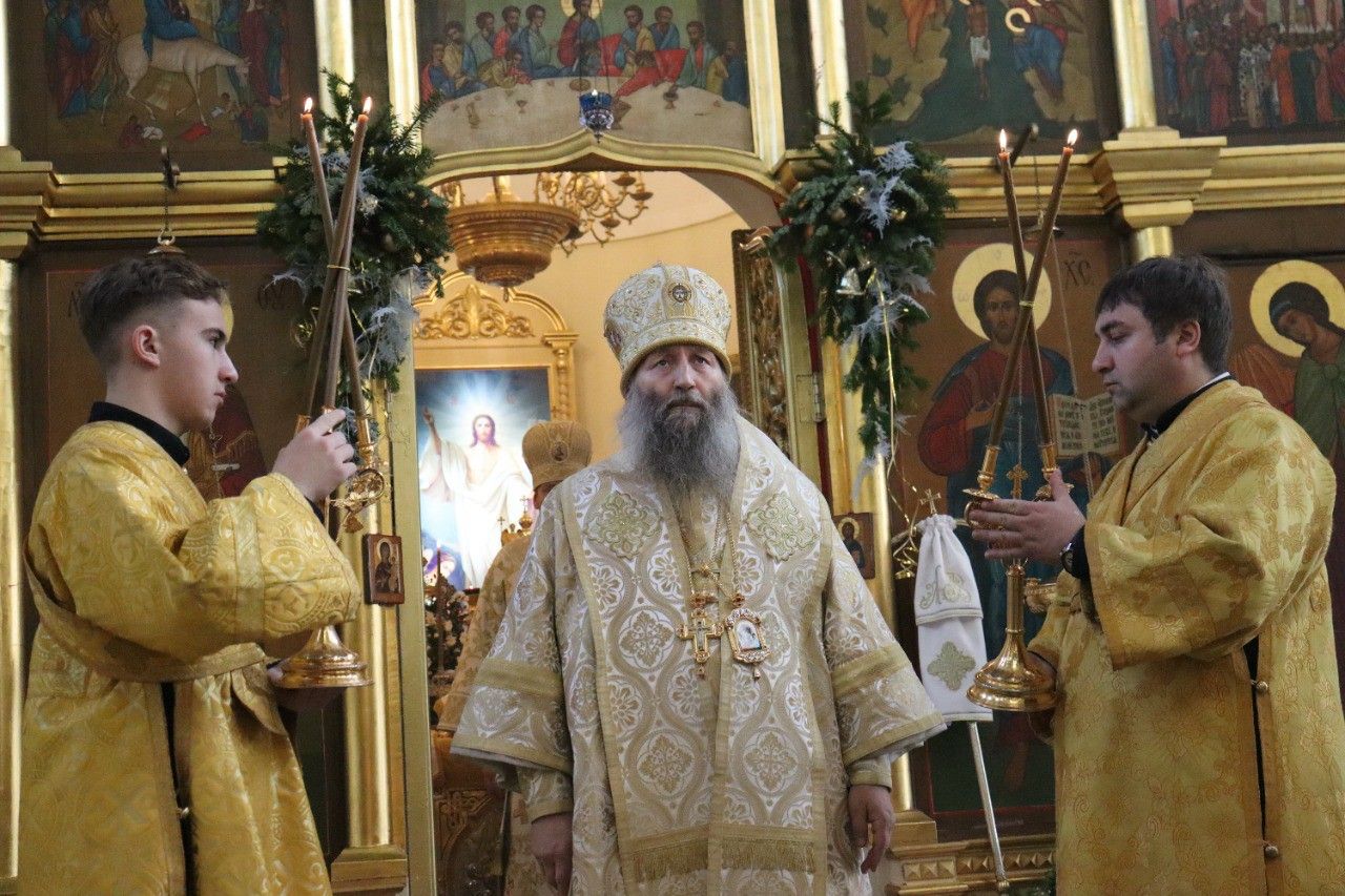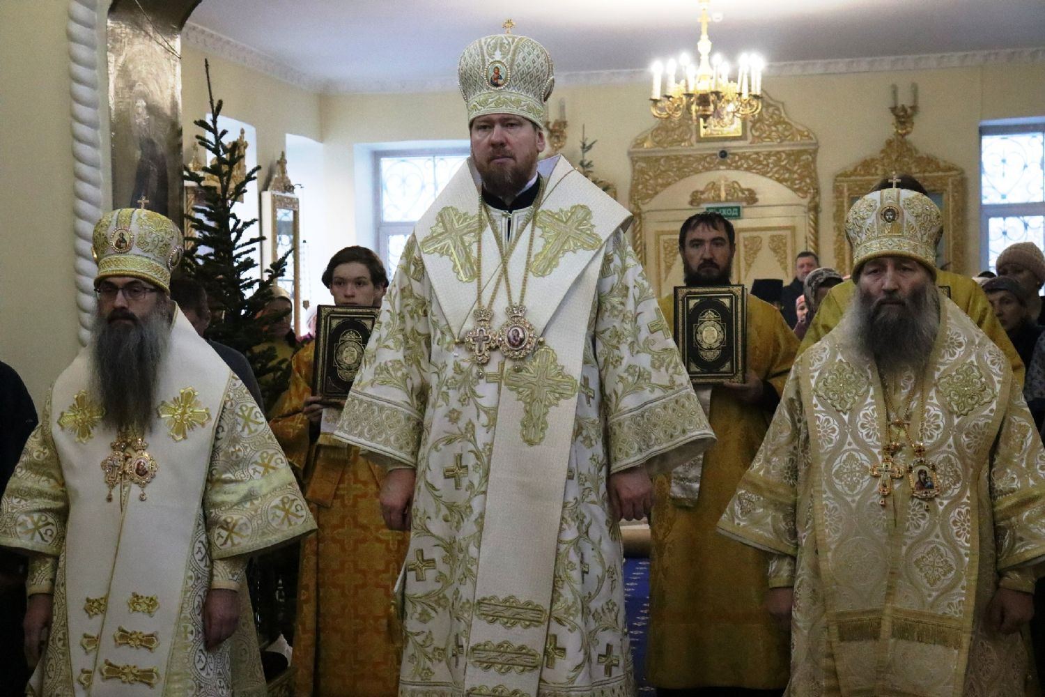 В завершение богослужения епископ Гурий поздравил митрополита Владимира с Рождеством Христовым. Благочинный Свято-Никольского собора игумен Алексий (Несмеев) от имени клира и прихожан поблагодарил за архипастырский визит и преподнес букет цветов.