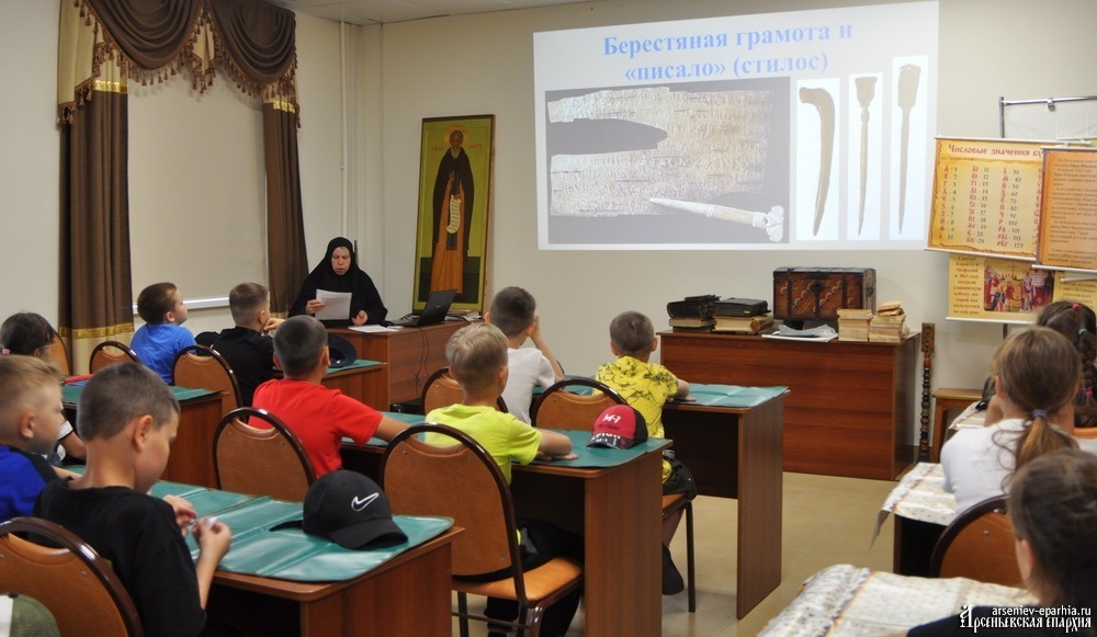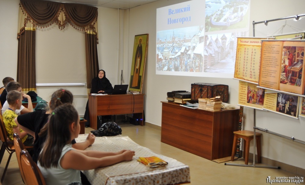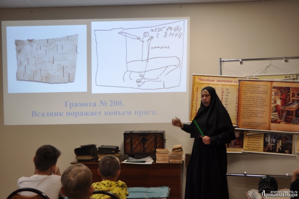 Так, в один из июньских дней инокиня Мария (Воробьева) рассказала учащимся Гимназии №7 о том, что первые книги были рукописными и писались не на бумаге, которая тогда была редкой и дорогой, а на пергаменте – особым образом на выделанных шкурах животных, об истории берестяных грамот и восковых дощечек, а также о том, как люди учились грамотности на новгородской земле. Ребята узнали, как в 1951 г. нашли в Новгороде первую берестяную грамоту, первое письмо, написанное много столетий назад и сохранившееся на куске березовой коры, бересте. Присутствующие смогли расшифровать берестяную записку озорного мальчишки из 13 века, Онфима, который в свои 7 лет уже умел писать.