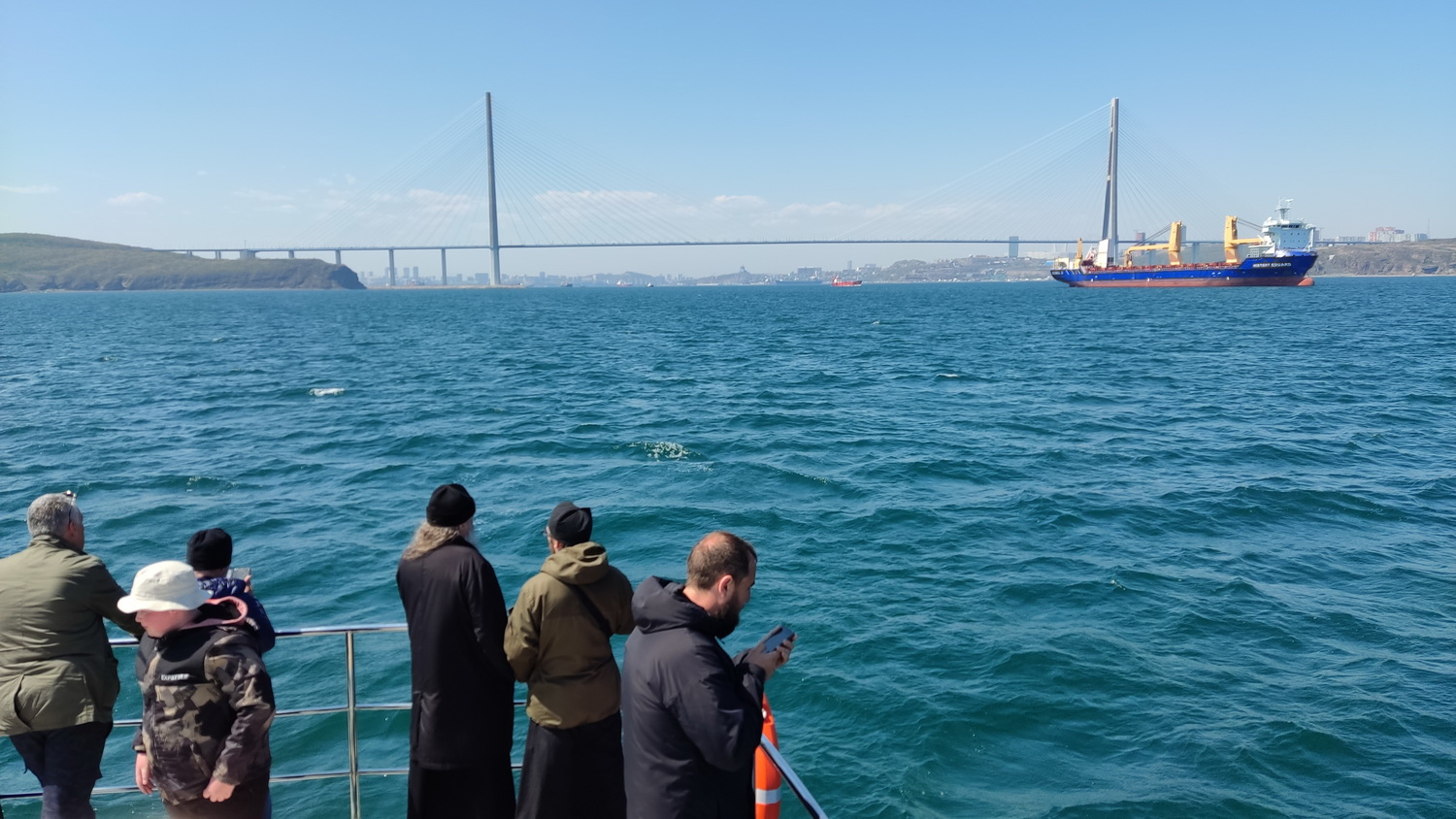 Первая группа паломников тем временем не сидела на берегу без дела и, возглавляемая неутомимым о. Василием, совершила поход по узкой полузатопленной приливом косе к маяку Токаревского. Смельчаки разулись и босиком преодолели 100 с небольшим метров по ледяной воде туда и обратно.