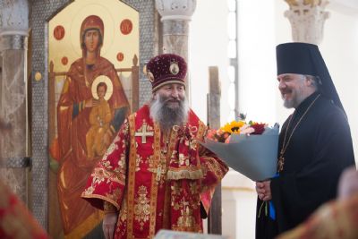 В ответном слове владыка Николай поблагодарил епископа Гурия за визит и преподнес ему букет цветов.