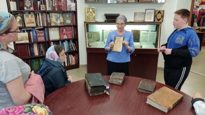 Помимо выставочных экспонатов, которые можно и нужно трогать руками, в центре проходят различные встречи и конкурсы: детский конкурс рисунков Пасха Красная, конкурс проектов Герои Отечества и др. А ещё в здании находится епархиальная библиотека, имеется фонд древних книг. Самая древняя рукописная книга в коллекции – начала 17 века, – служба св. пророку Иоанну Предтечи. Имеется книга о Николае Чудотворце, изданная по указу Петра Первого. Хочется выразить слова благодарности Ирине Геннадьевне Бердниковой, замечательному экскурсоводу, за прекрасную экскурсию. Что сказать, владыке удалось нас удивить! Честно говоря, я не ожидал увидеть в столь отдалённом крае, каким я его представлял до поездки, такого размаха и столь обширной и качественной экспозиции.