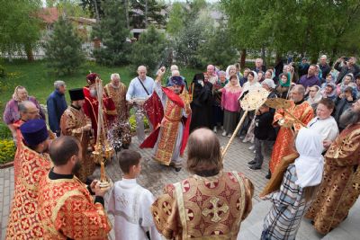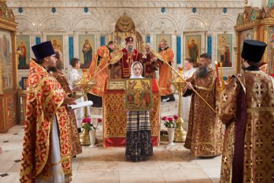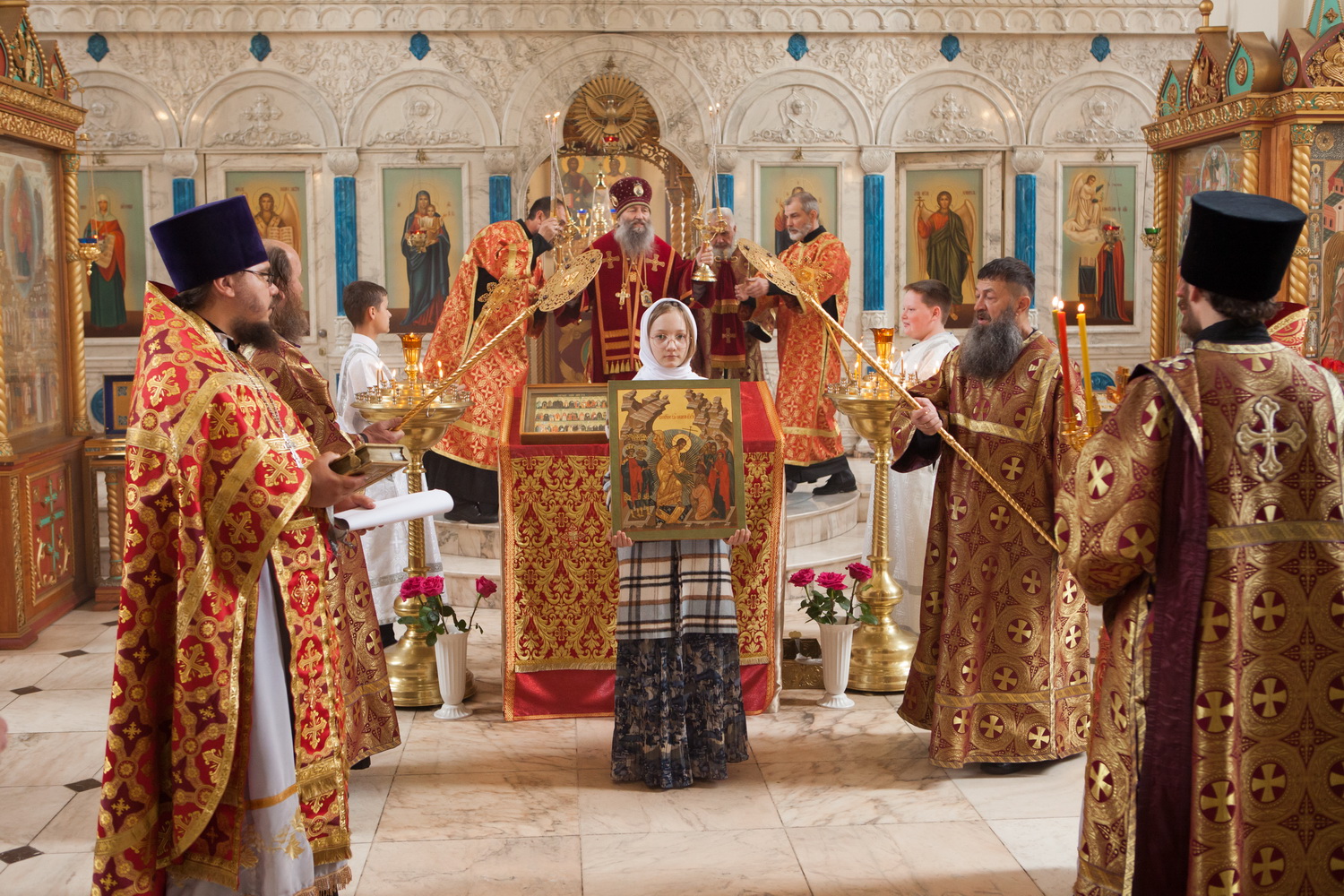 Владыка Гурий познакомил нас с Кафедральным Благовещенским собором, это новый храм, его строительство было начато в 2007 году. Интересен был рассказ владыки о появлении некоторых икон в соборе, – Сладкое Лобзание привезена из Новгорода Великого, подарок Новгородского владыки. Икону св. Матроны Московской с частичкой мощей, вышитую монахинями, подарили владыке в Покровском монастыре.