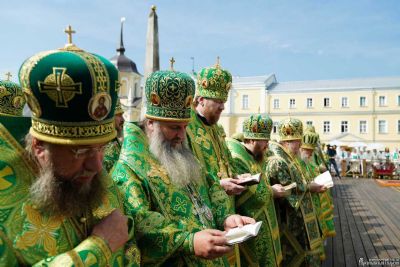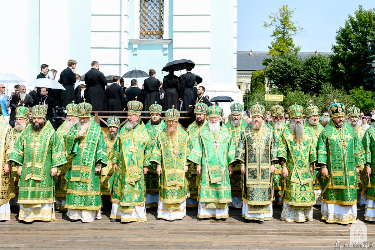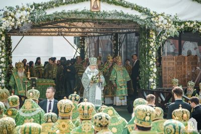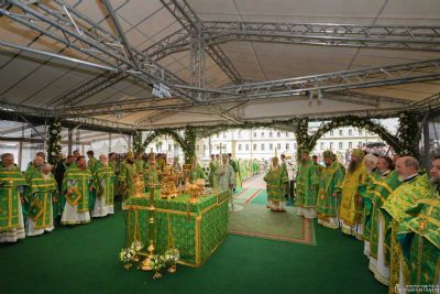 Для совершения праздничных Всенощного бдения и Божественной литургии на Соборной площади был устроен помост, а перед Успенским собором Лавры – престол под сенью.