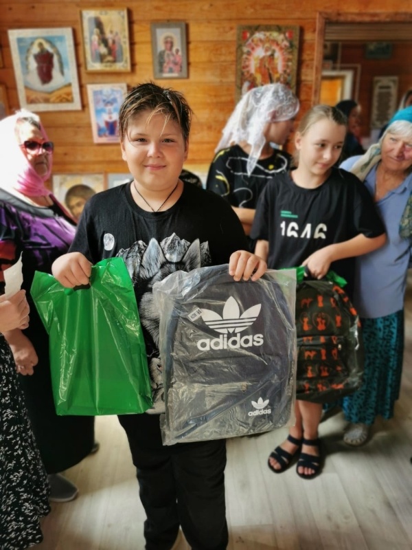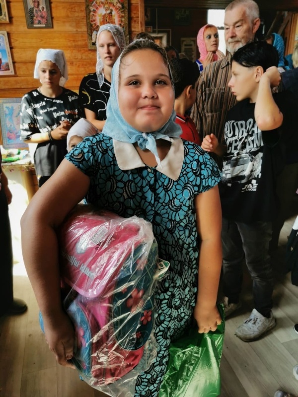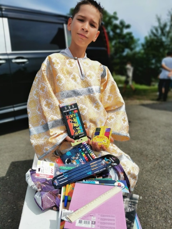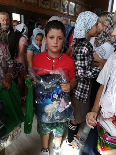 Затем батюшка вручил 52 ребятам в подарок школьные наборы, канцелярию, портфели.