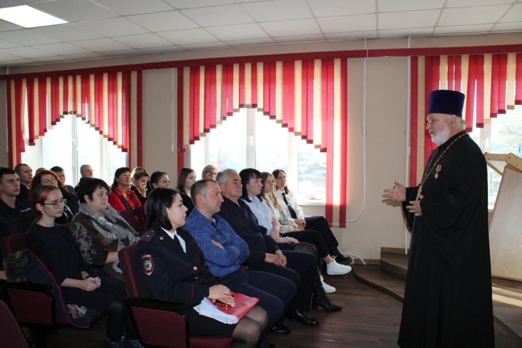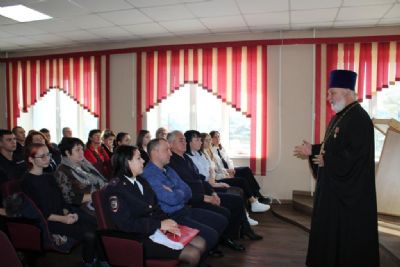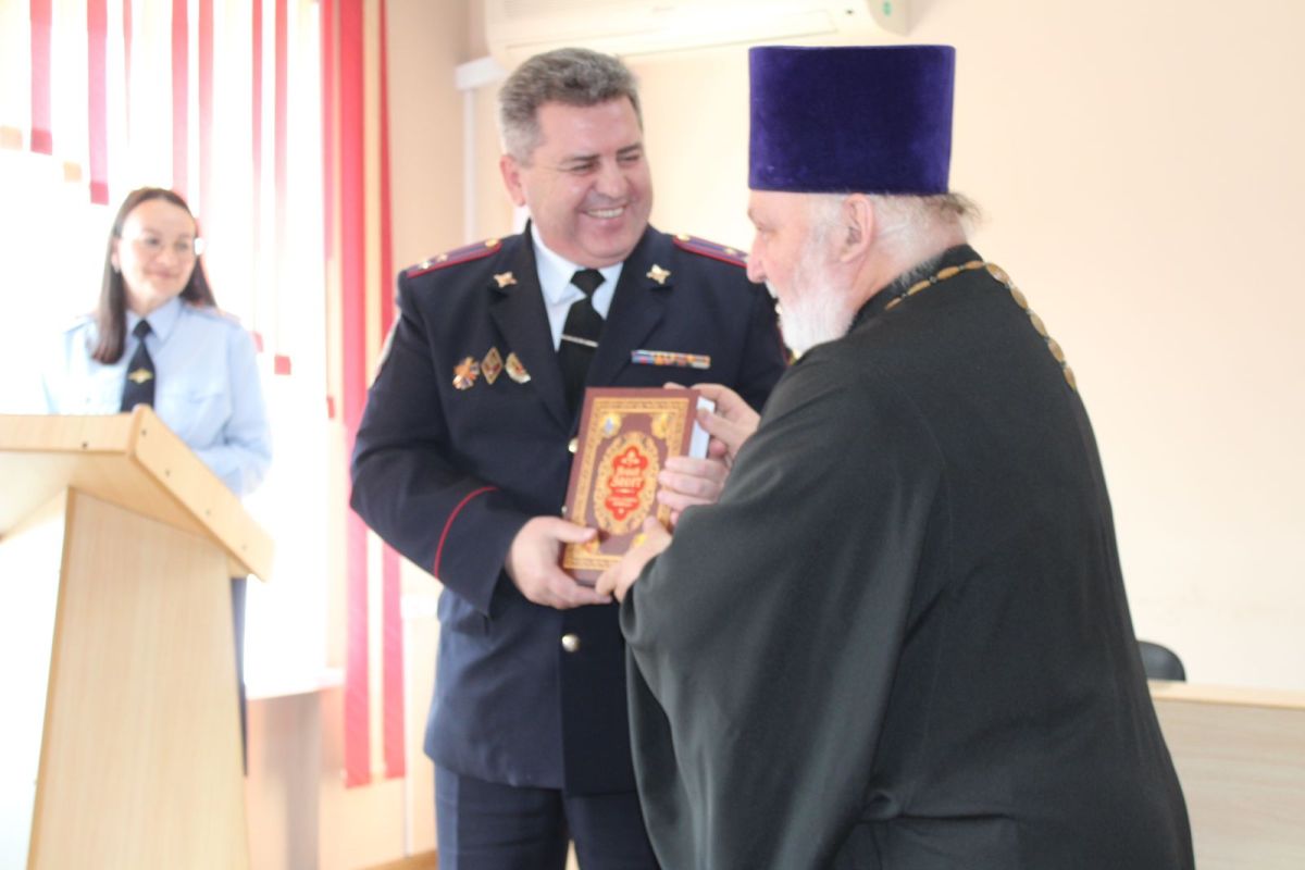 Отец Константин поздравил работников милиции, сотрудников МВД с профессиональным праздником от лица Арсеньевской епархии, пожелав крепости духовной и телесной, благополучия и успехов в служении на благо России и Арсеньева, а также вручил Константину Рудольфовичу Закон Божий.