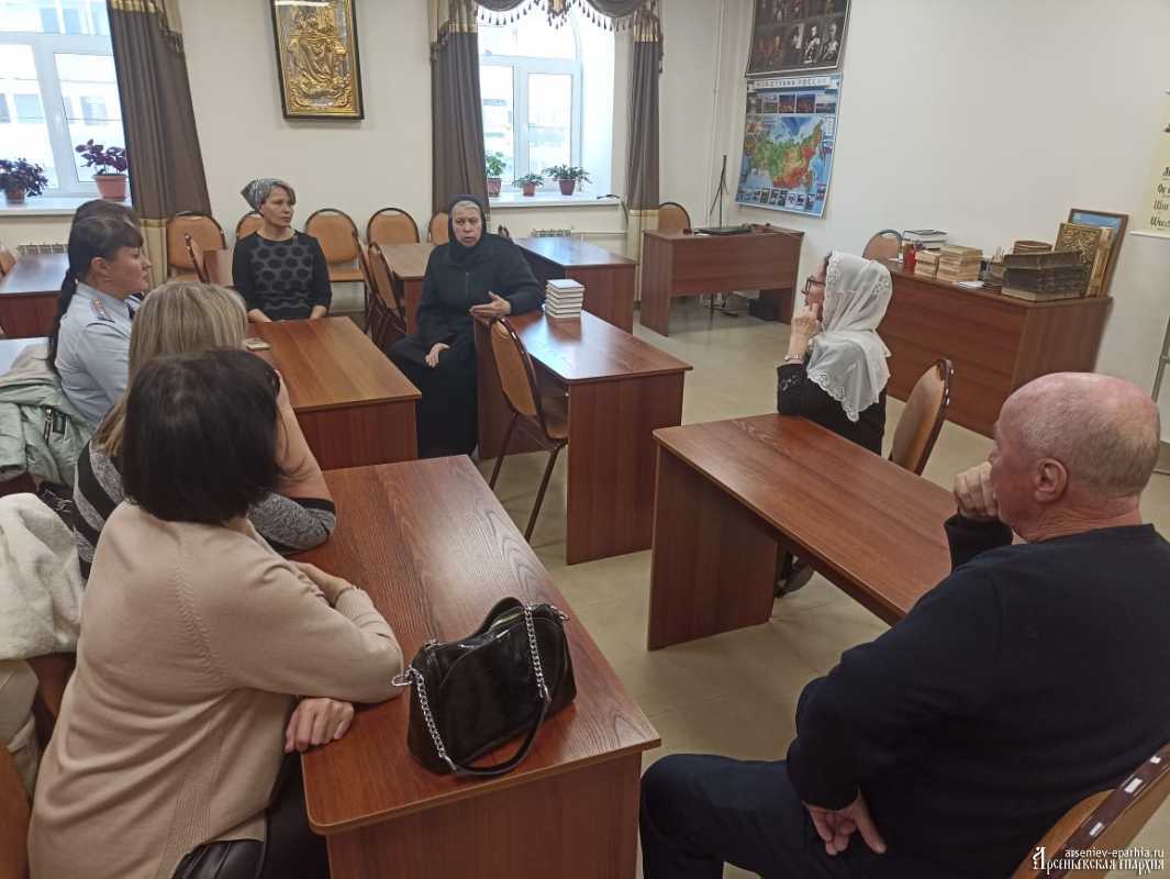 Началось совещание с ознакомительной экскурсии инспекторов по Центру. После чего гостям было рассказано о мероприятиях, проводимых в стенах Центра и за его пределами и целях их проведения: духовно-нравственной, просветительской, гражданско-патриотической. Также м. Мария освятила планы дальнейшей работы, Валерий Владимирович предложил найти способы сотрудничества и взаимодействия. Ирина Геннадьевна, в свою очередь, рассказала о семинарах, круглых столах для педагогов г. Арсеньева и предложила принять участие в их проведении.