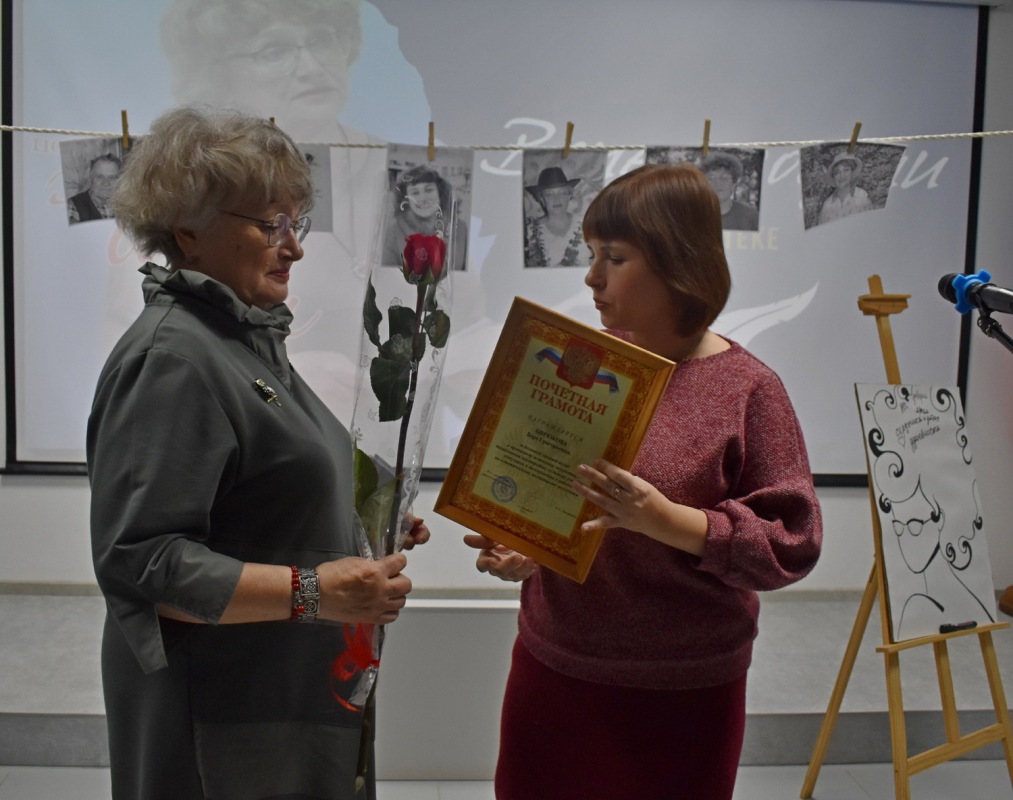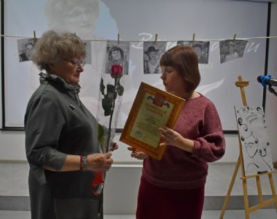 В заключение вечера ведущий специалист управления культуры администрации Арсеньевского городского округа Олеся Нуреева поздравила юбиляра с праздником и вручила грамоту за большой личный вклад в пропаганду истинного искусства, поэтического мастерства и бескорыстную работу по эстетическому воспитанию молодежи, отметив тесное сотрудничество поэта и ЦГБ.