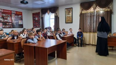 О маленьких патриотах Великой Отечественной войны рассказала учащимся инокиня Мария (Воробьёва), куратор грантовых проектов Арсеньевской епархии.