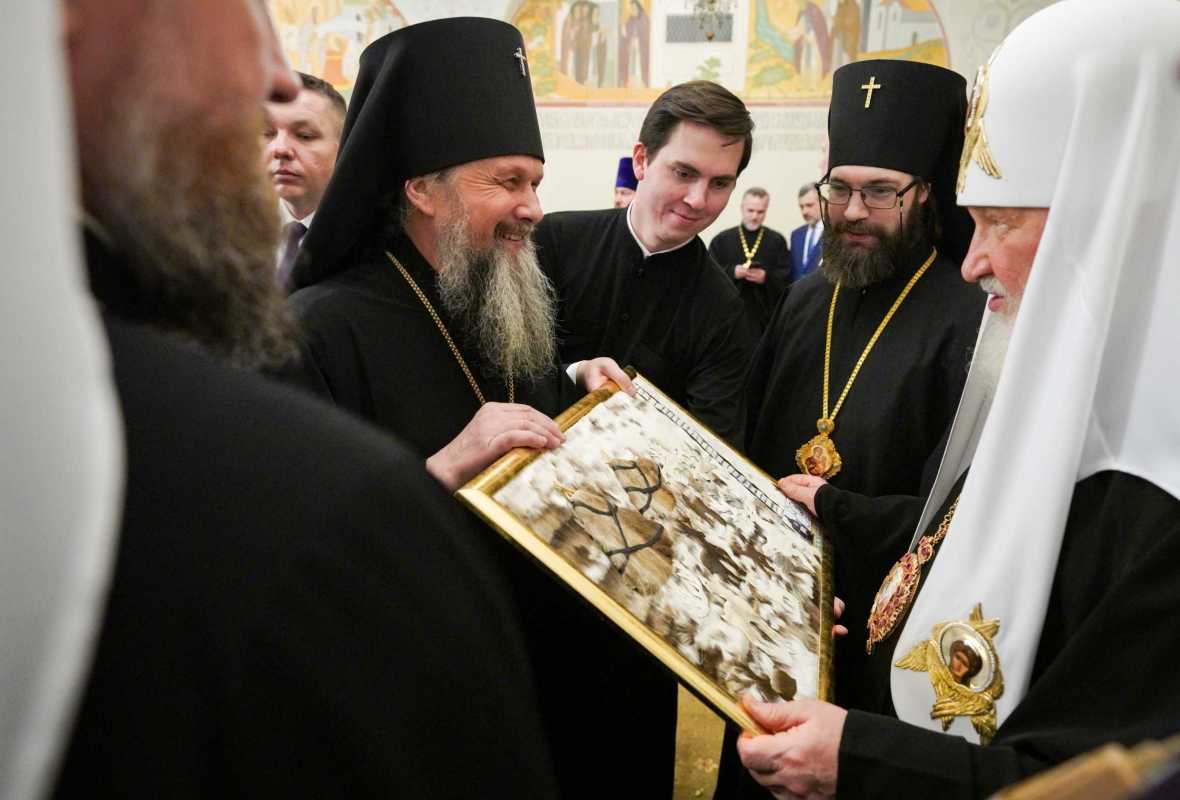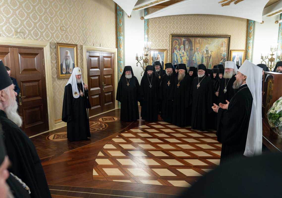 В Красном зале Святейший Патриарх Московский и всея Руси Кирилл принял поздравления от делегации Белорусского экзархата во главе с митрополитом Минским и Заславским Вениамином.