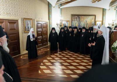 В зале собрались Преосвященные викарии, благочинные церковных округов, наместники и игумении ставропигиальных монастырей.
