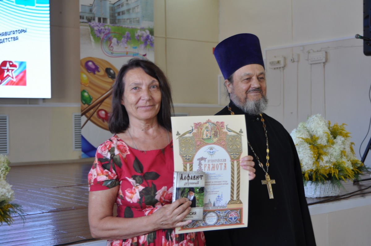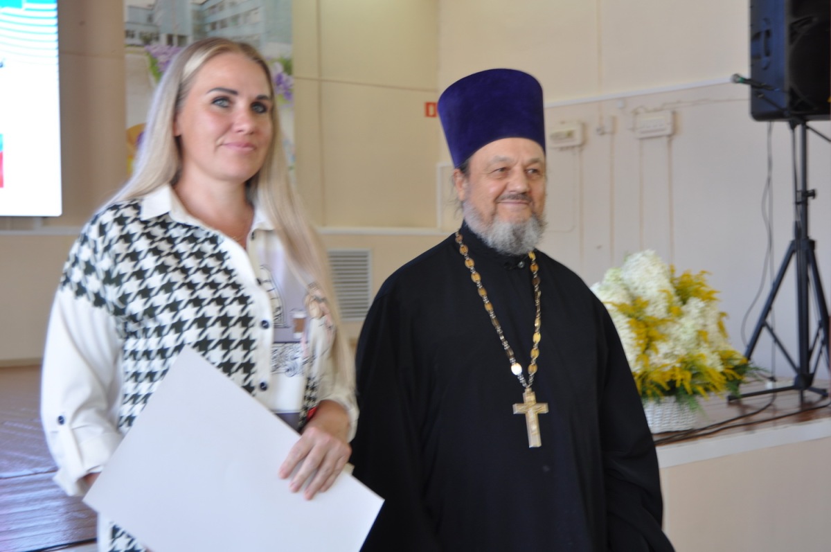 С приветственным словом и пожеланием Божьего благословения к педагогам обратился протоиерей Николай Хоменко. Он вручил им Архиерейские грамоты за труды на благо Церкви.