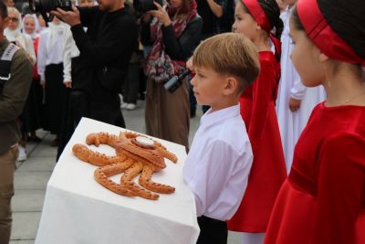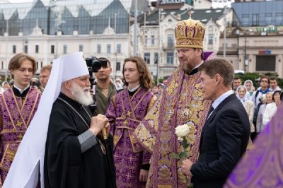 Перед началом Богослужения митрополита Павла встречали с букетами цветов митрополит Владимир и губернатор Приморского края О.Н. Кожемяко, затем владыку приветствовали учащиеся воскресных школ, которые преподнесли ему хлеб-соль.