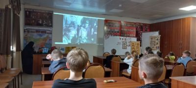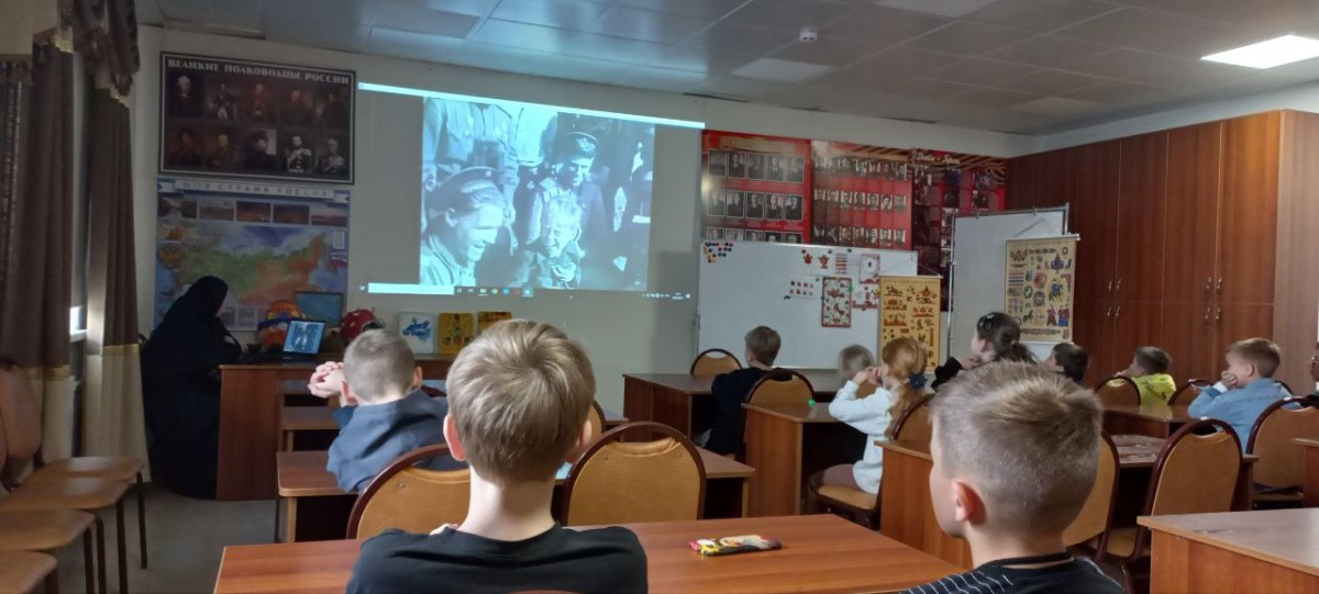 Затем мать Мария предложила присутствующим посмотреть видеофрагменты о Великой Отечественной войне и порассуждать об исторических событиях и роли детей в общей Победе.