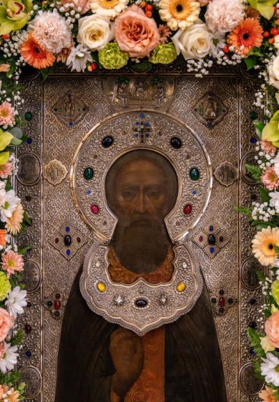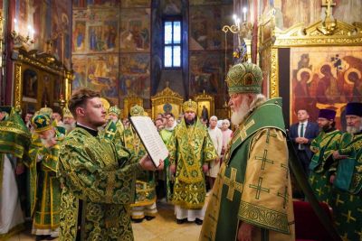 По окончании Литургии Святейший Патриарх Кирилл совершил в Успенском соборе молебен перед чтимой иконой преподобного Сергия Радонежского.