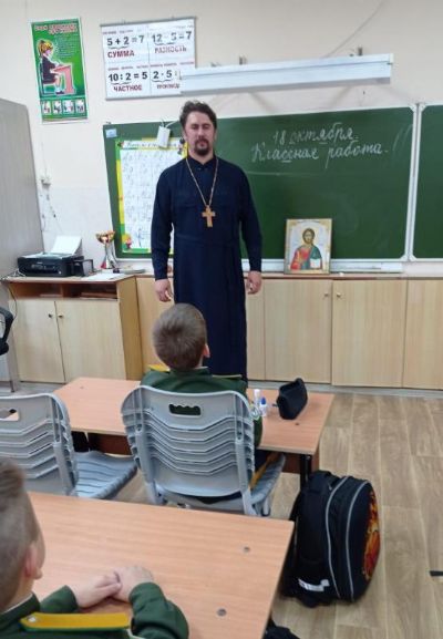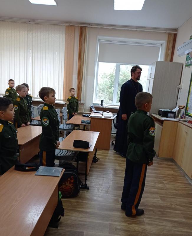 Настоятель храма Архангела Михаила г. Арсеньева, иерей Михаил Котенко, провел беседу о сотворении мира и Ангелах с учащимися казачьих классов МОБУ «СОШ №10».