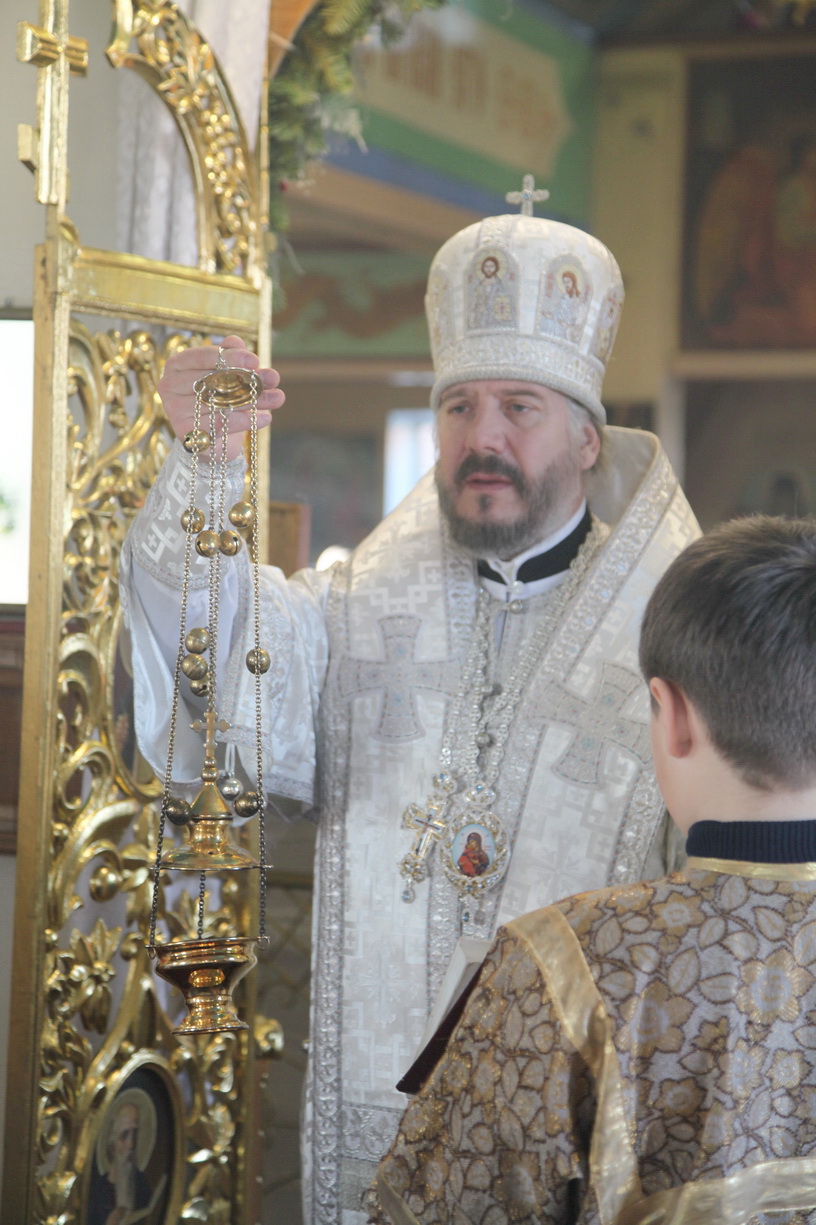 По заамвонной молитве, епископ Николай возглавил праздничное славление и обратился ко всем присутствующим с архиерейским словом, в котором поздравил настоятеля и прихожан храма с престольным праздником и Рождественскими святками. В ответном слове иерей Иоанн Капитанюк поблагодарил епископа Николая за архипастырский визит и поздравил его в праздником Рождества.