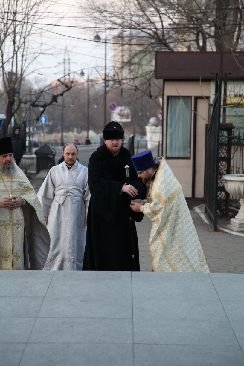 Владивосток. 20 января 2019 года, в Неделю 34-ю по Пятидесятнице, в попразднство Богоявления и собор Предтечи и Крестителя Господня Иоанна митрополит Владивостокский и Приморский Владимир возглавил Божественную в сослужении архиереев митрополии: епископа Уссурийского Иннокентия, викария Владивостокской епархии, епископа Находкинского и Преображенского Николая; епископа Арсеньевского и Дальнегорского Гурия. С архиереями служили также благочинный I округа Владивостокской епархии протоиерей Димитрий Федорин; ключарь Покровского кафедрального собора протоиерей Александр Талько; протоиерей Сергий Шуталев; иерей Владимир Брагин; иеромонах Иоанн (Костин) и клирики Покровского кафедрального собора.