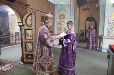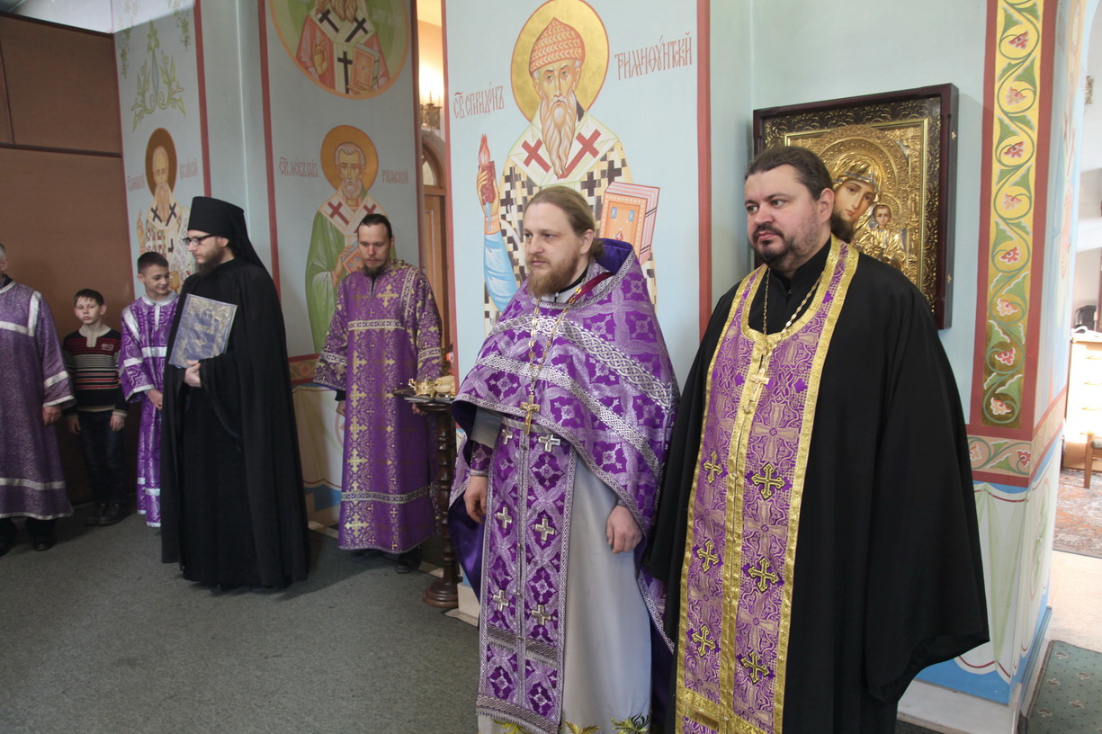 Его преосвященству сослужили: иерей Георгий Москаленко; иерей Андрей Калнин, ризничный собора, иерей Виталий Шаркеев, иерей Андрей Попов; иеромонах Ермоген (Крещенко).
