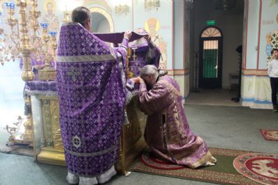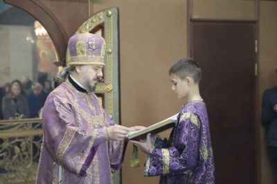 Его Преосвященству сослужили: иерей Георгий Москаленко; иерей Андрей Калнин; иерей Виталий Шаркеев; иерей Андрей Попов.