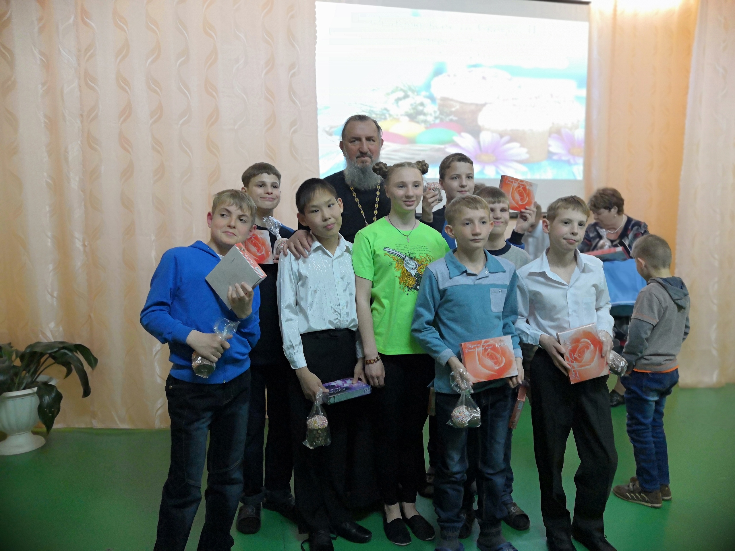 Иерей Георгий Москаленко, вместе с сотрудниками отдела по церковной благотворительности и социального служения Находкинской епархии, поздравил с Пасхой Христовой воспитанников и педагогов «Коррекционной школы-интерната для детей-сирот и детей оставшихся без попечения родителей» и городского детского реабилитационного центра «Альбатрос».